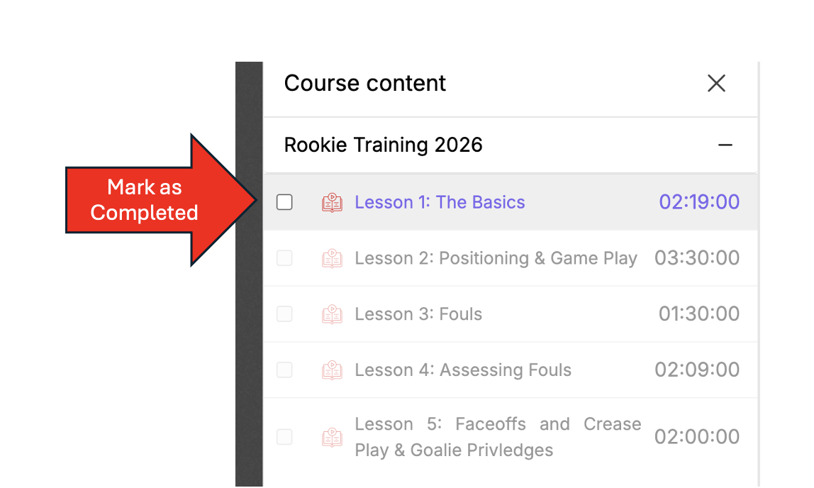 - Complete Lesson: Watch the recording and when done, please be sure to click the completed button on the right hand side for each lesson!
